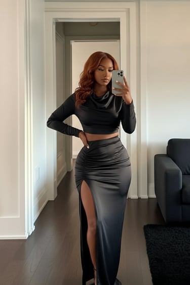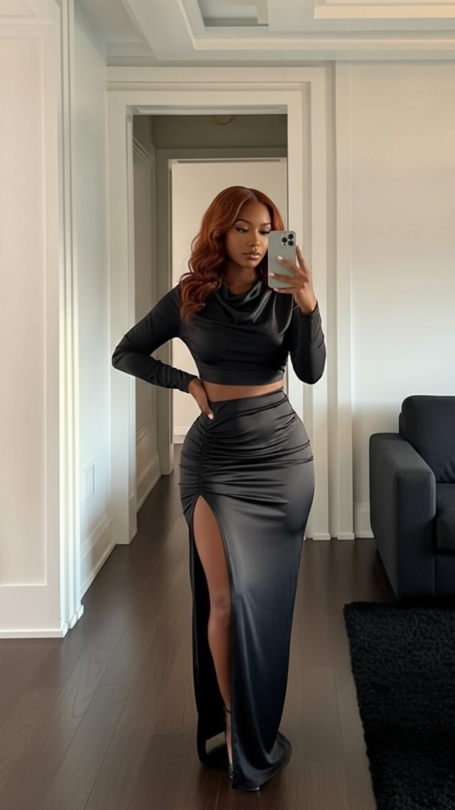 The design hugs your curves in all the right places while keeping it chic and refined. The long-sleeve satin blouse pairs beautifully with the high-waisted slit skirt, creating a silhouette that’s both graceful and bold. It’s a look that says “I made an effort” without even trying.