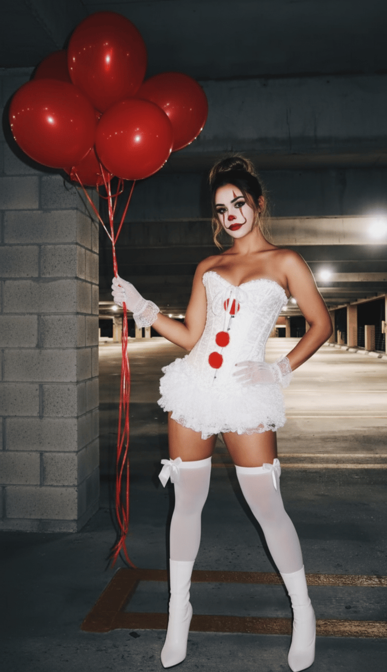 Forget the frills of your average clown costume; this look blends sexy sophistication with Halloween chaos in the best way possible. The white lace corset sculpts your waist to perfection, while the flirty ruffled shorts (or tutu) add a playful twist that keeps all eyes on you. Every detail, from the red balloon props to the bow-topped thigh highs, tells a story of dangerous charm.